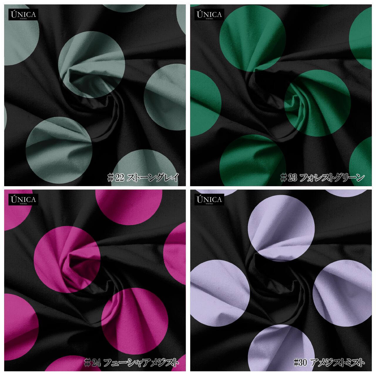 また生地のコーディネートを幅広くお楽しみいただけるよう、水玉模様のサイズ違いやカラーを反転した生地など、様々な組み合わせをお楽しみいただけます。